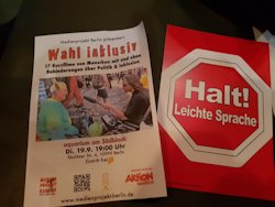 Zum Zweiten hat das Medienprojekt Berlin vier Wahlclips erstellt, in denen Betroffene erläutern, wo genau der Schuh drückt, wenn es um Rechte für Menschen mit Behinderungen geht. Diese Wahlclips waren die Einspieler zu Beginn der Diskussion zu den Themen